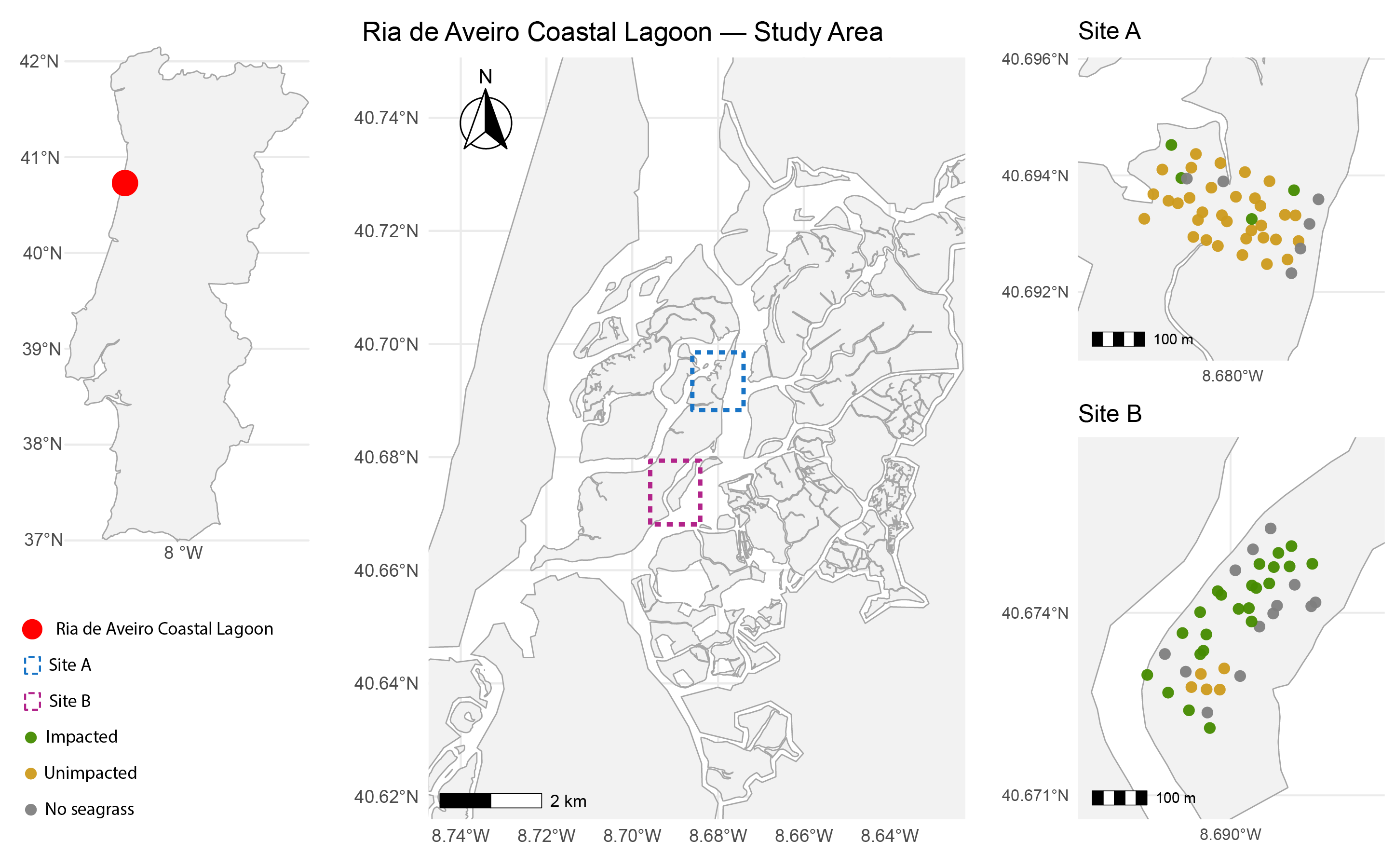 A field campaign was conducted in the seagrass meadow of the Ria de Aveiro Coastal Lagoon (Portugal) from July 14 to 18, 2025. Two distinct study areas were selected, and within each, a grid of randomly distributed sampling stations was established, covering a total surface of 5.6 ha (Figure 13). At every station, a photo-quadrat of the meadow was collected. Each quadrat image was subsequently analyzed in the laboratory by independent observers, who classified the meadow condition as either impacted by heat stress (i.e., leaves showing visible discoloration or browning) or unimpacted (i.e., leaves appearing green and healthy). This set of visual classifications was used as the ground-truth dataset.