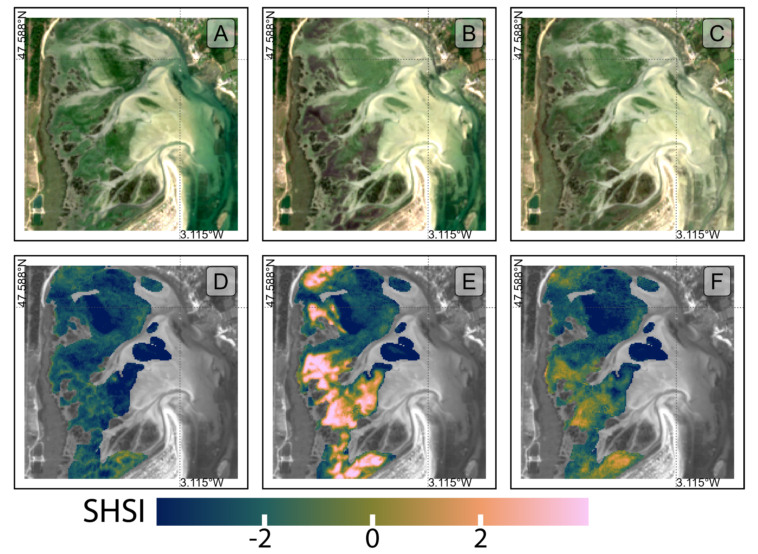 The Seagrass Heat Shock Index (Equation 3) developed in this study makes it possible to detect reductions in the green and the Red-Edge regions caused by thermal stress using only three reflectance bands (560 740 and 840 nm). These spectral bands are available in current (i.e. Sentinel-2, Pleiades-Neo, WorldView-3, SkySat, and GeoSat-2) and future multi-spectral missions (i.e. Sentinel-2 Next Generation and Landsat Next), opening new perspectives for the detection and monitoring of heatwave effects on intertidal seagrass. As shown in the next section, SHSI can be used to assess the extent and severity of darkening events across intertidal seagrass meadows from high resolution satellite images.