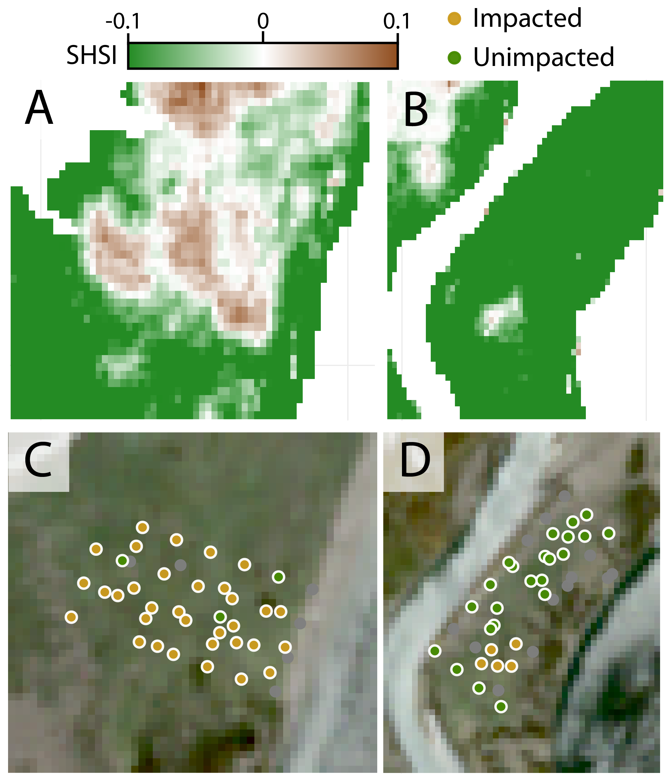 The SHSI (Equation 3) was computed and mapped for each image. For the pixel containing a field QP (Figure 4), the satellite-derived reflectance was extracted, and compared before and after the HW event.