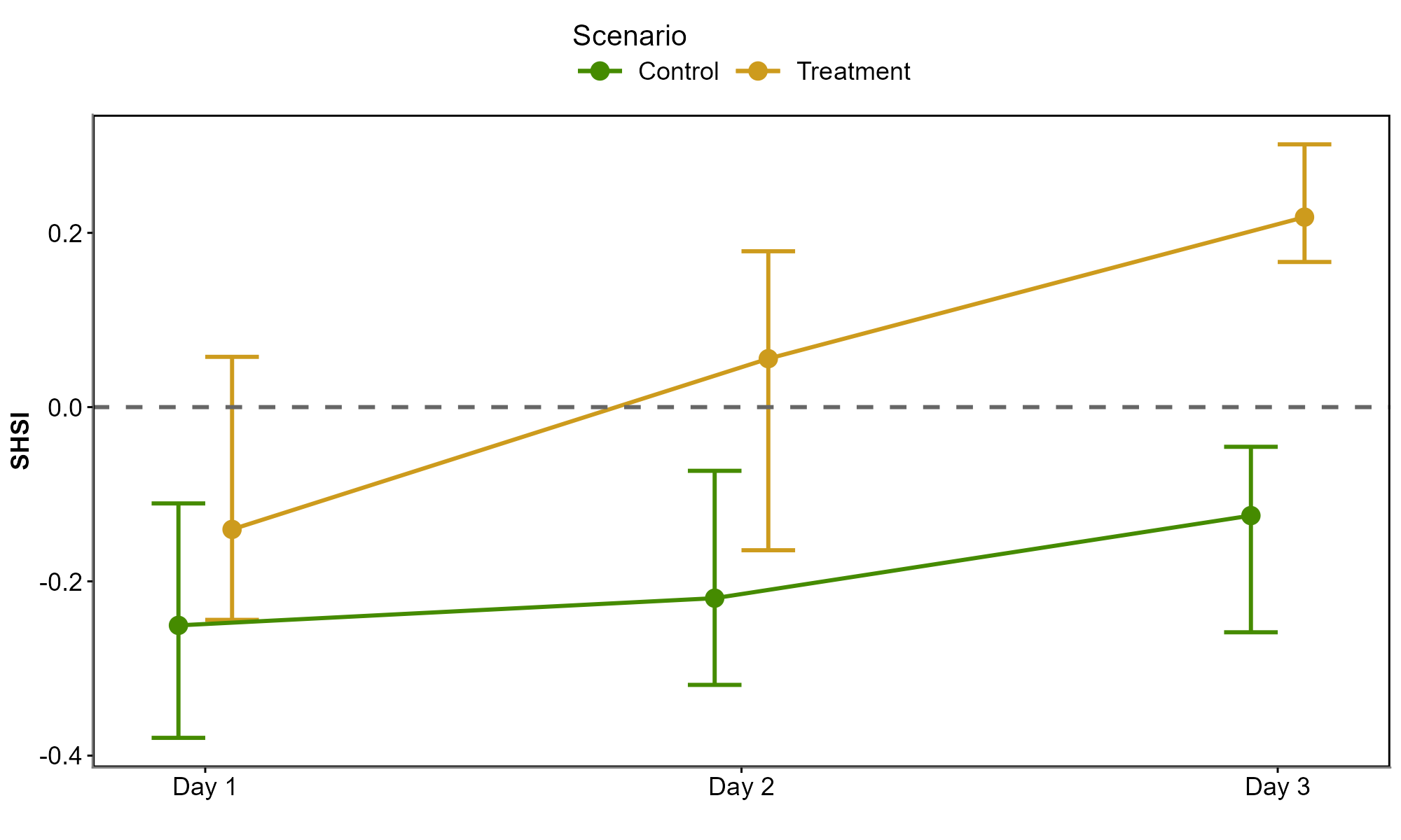 Unlike the other metrics, the SHSI of the Treatment was on average % lower than that of the Control in day 1 (Figure 7 D). By day 2, the SHSI exhibited a rapid increase of approximately %, eventually reaching an overall rise of % by day 3.