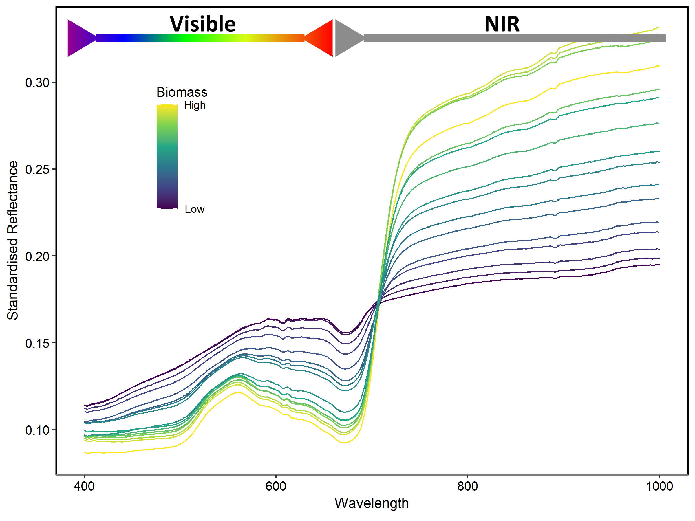 \[NDVI = \frac{R(NIR)-R(Red)}{R(NIR)+R(Red)}\]