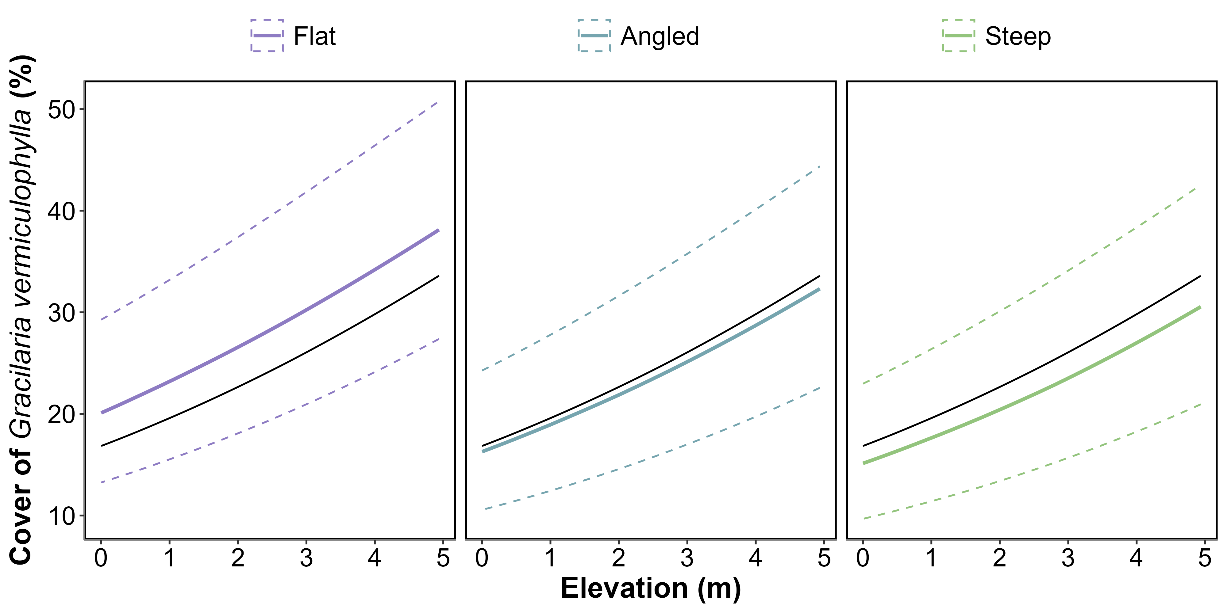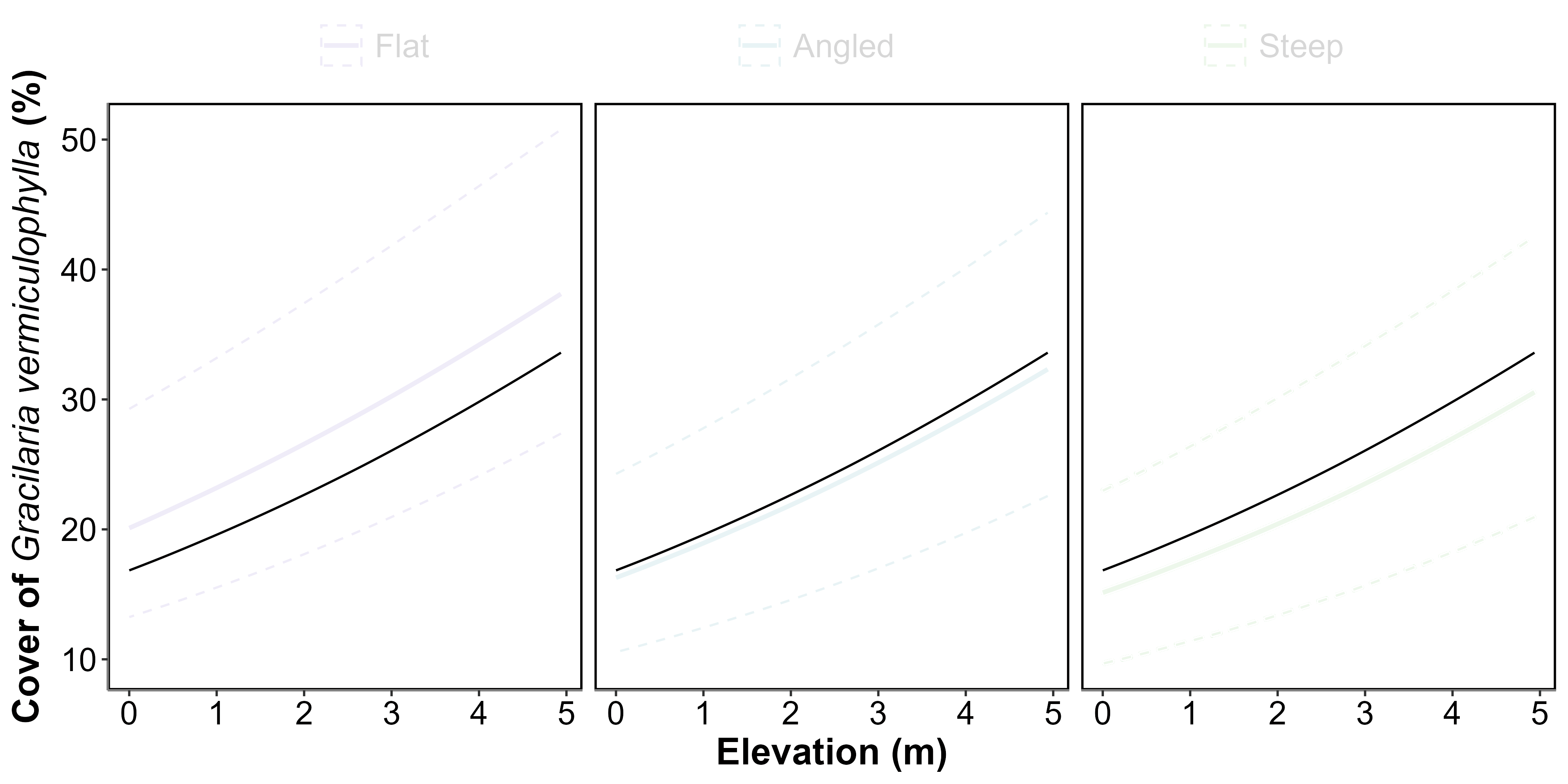 \[ \begin{align*} \mathrm{Cover}_{ij} &\sim \mathrm{Beta}\bigl(\mu_{ij}\,\phi,\,(1-\mu_{ij})\,\phi\bigr),\\[1em] \mu_{ij} &= \mathrm{logit}(\eta_{ij}), \\[1em] \eta_{ij} &= \underbrace{\alpha_j}_{\substack{\text{intercept for}\\\text{site }j}} + \underbrace{\beta_1\,\mathrm{Bathymetry}_{ij}}_{\text{effect of elevation}} + \underbrace{\beta_2\,\mathrm{Slope}_{ij}}_{\text{effect of slope}}. \end{align*} \]