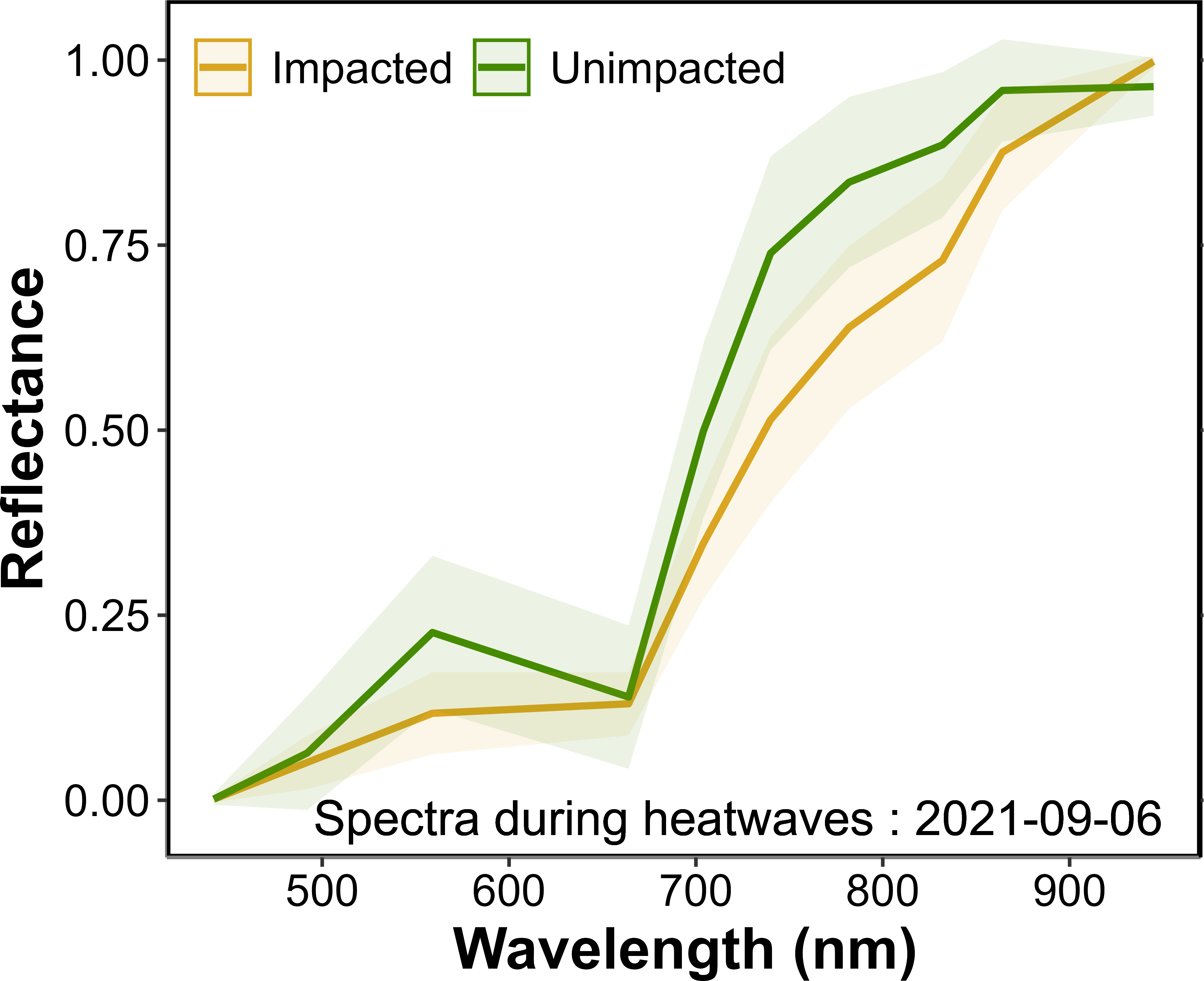 Heatwaves alter the spectral reflectance of Zostera noltei seagrass. This change can be detected using remote sensing.