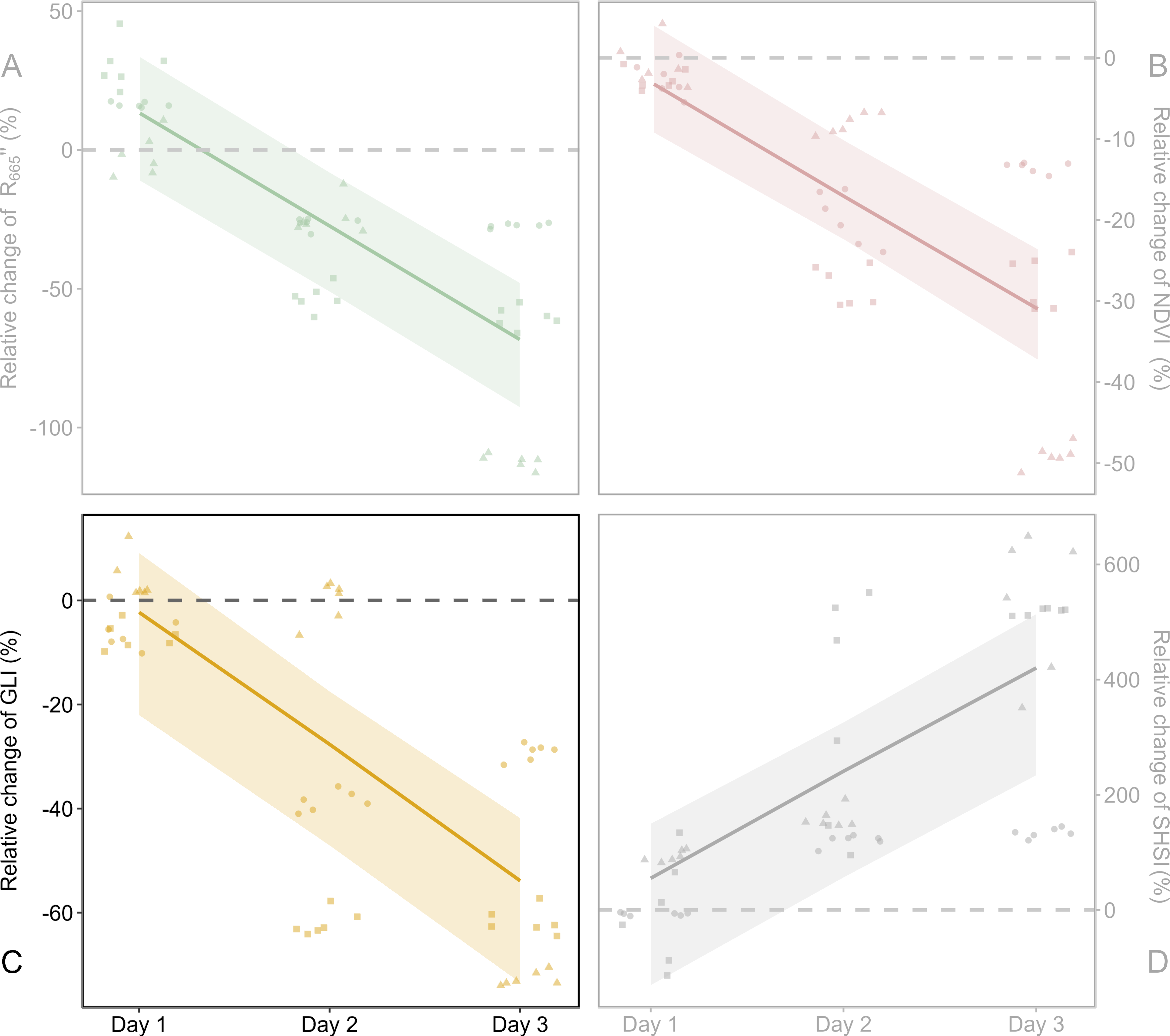 \[GLI = \frac{[R(Green)-R(Red)]+[R(Green)-R(Blue)]}{(2 \times R(Green) )+ R(Red) + R(Blue) }\]