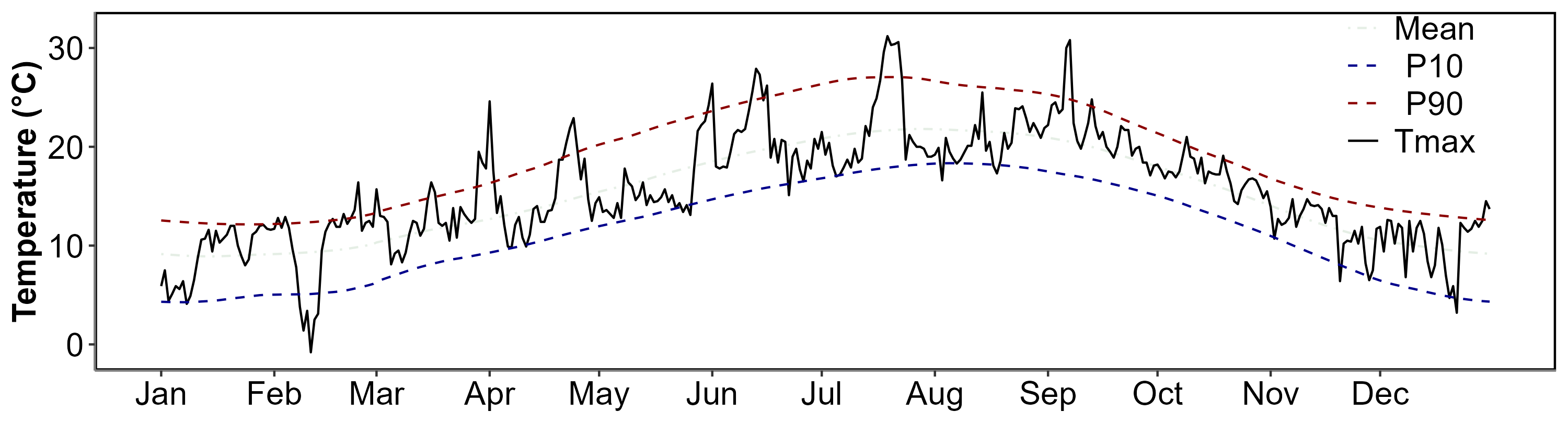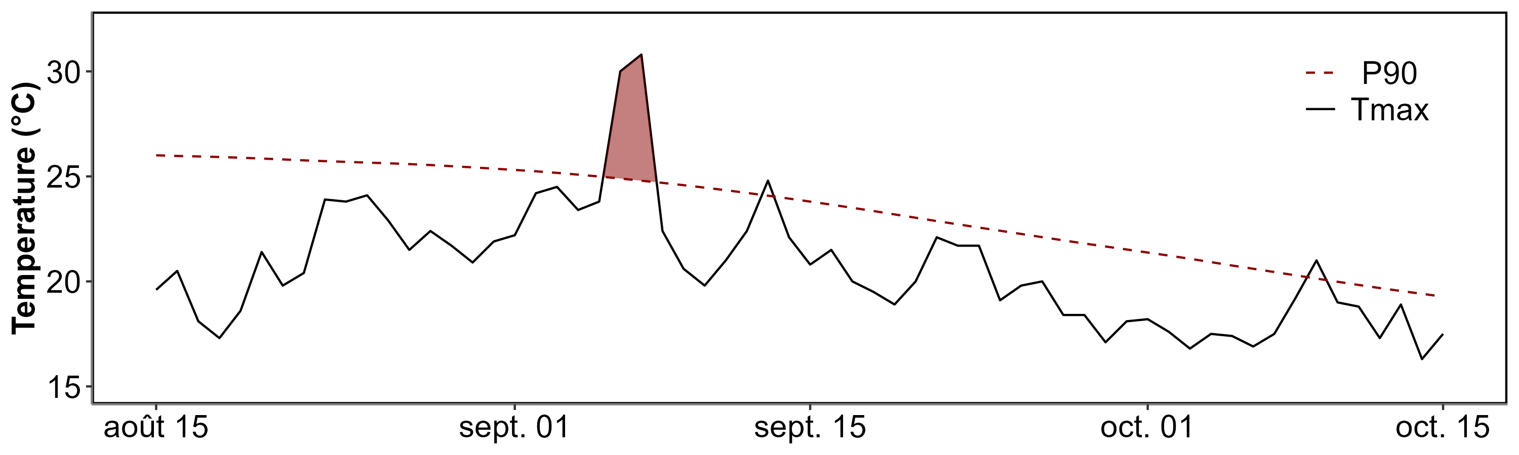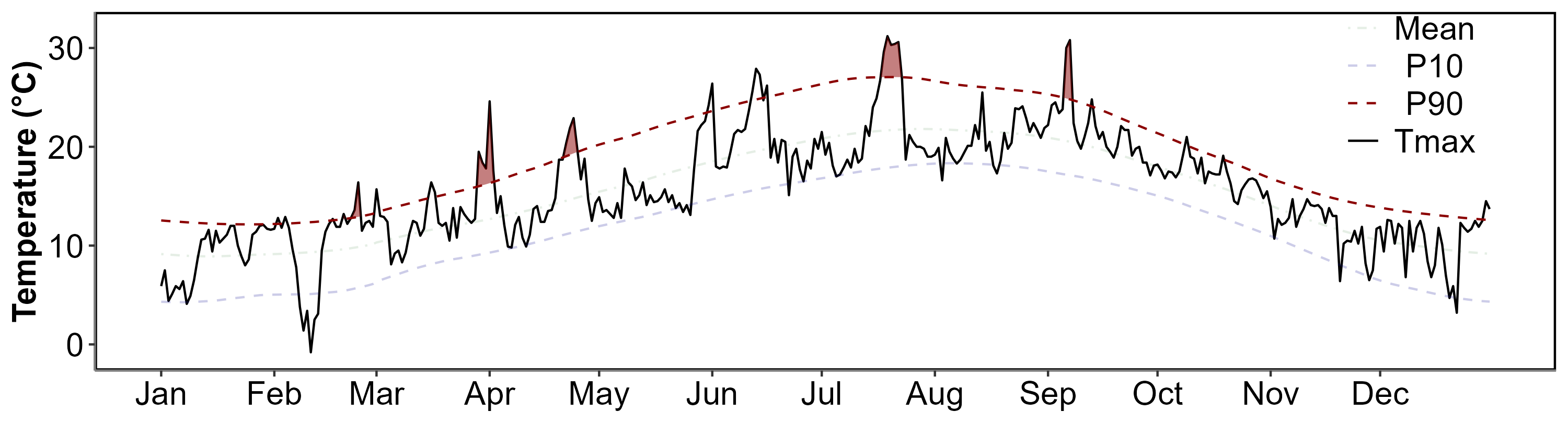 Defined as periods of three or more consecutive days where the daily maximum temperature (Tmax) exceeds the calendar-day 90th percentile based on at least 30 years